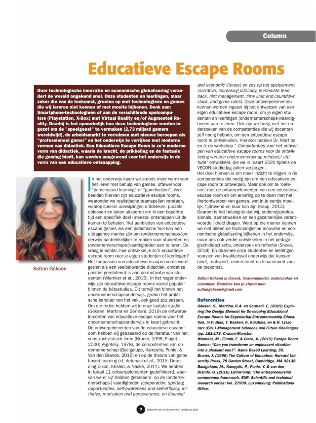 Mijn nieuwe column in de TEO (Tijdschrift voor het Economie Onderwijs) nr. 1 2020 over Educatieve Escape Rooms. #educatieveescaperooms #hva #entrepreneurship #usasbe2020 #carem #escaperoom #educationdesign #jufgoksen