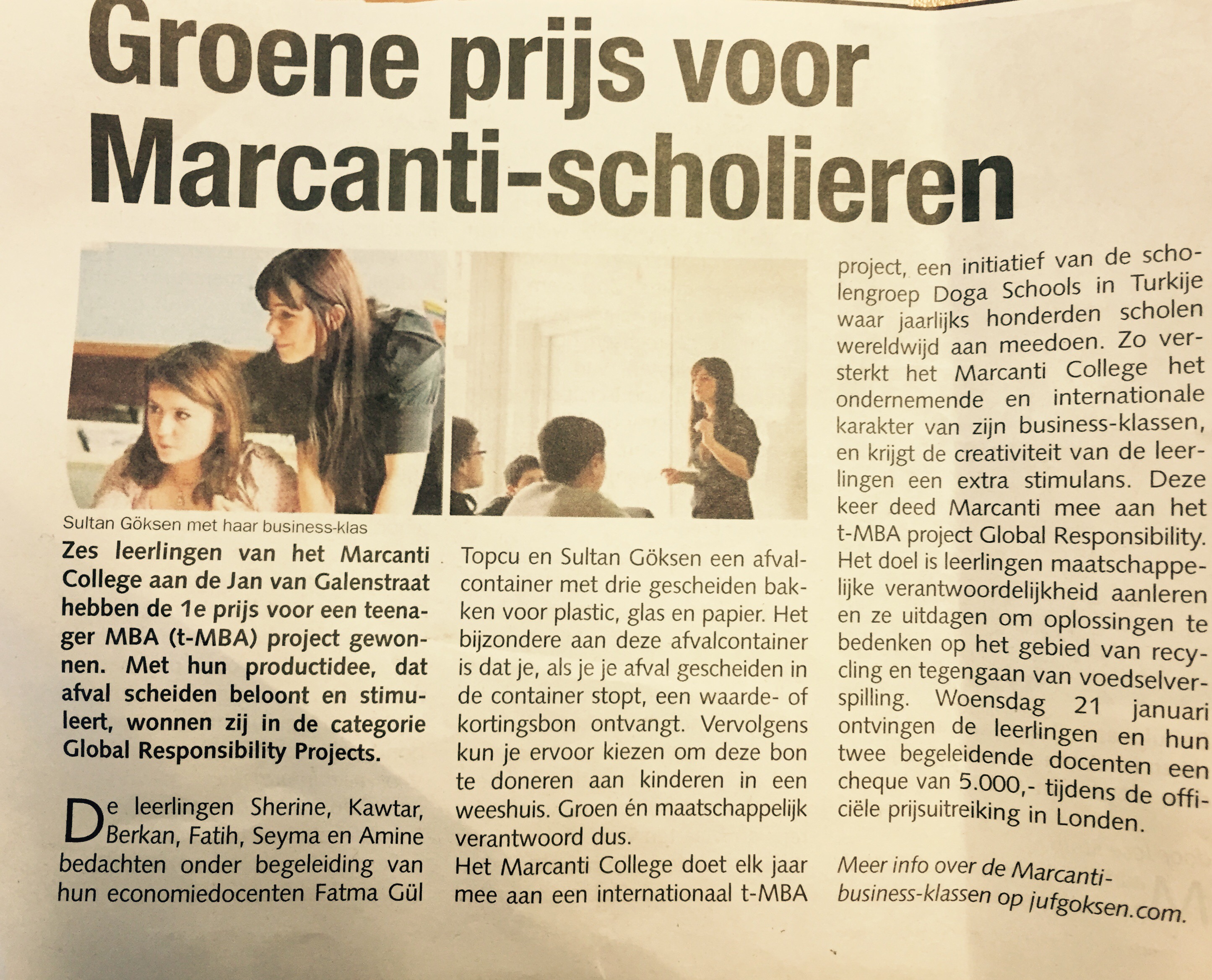 Het Marcanti College kiest er bewust voor om elk jaar aan verschillende t-MBA projecten mee te doen. Dit doen wij om de afwisseling binnen de Business + klassen te waarborgen en om de creativiteit van onze leerlingen te maximaliseren. Dit schooljaar heeft het Marcanti College besloten om mee te doen met het “Global Responsibility Project” van de t-MBA Doga Schools. Het doel was om onze leerlingen maatschappelijke verantwoordelijkheid aan te leren en hun uit te dagen voor het bedenken van projecten voor onder andere ”recycling” en ”food waste”. De projecten die onze leerlingen dit jaar hebben ingebracht onder leiding van hun docent Fatma Gul Topcu zijn: