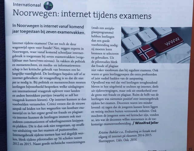 Zo stelt Sugata Mitra ons tijdens het congres Making Shift Happen 2015 de vraag: “Wat zou er gebeuren als we het gebruik van internet tijdens het eindexamen zouden toestaan?” Waarom klinkt dit als larie voor de gemiddelde docent? Waar zijn we bang voor? Bijvoorbeeld dat onze leerlingen alle antwoorden kunnen opzoeken? Wat zegt dat dan over onze eindexamenvragen? In hoeverre toetst dan het eindexamen de vaardigheden waar de wereld van nu om vraagt? En als het eindexamen dat al niet doet, in hoeverre doen methodes dat dan wel? Zeker als we weten dat de informatie uit een methode vaak voor 4-5 jaar vast staat en op internet de informatie soms zelfs na een minuut wordt geüpdatet.